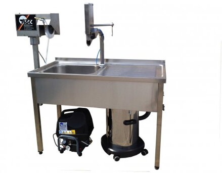 Znaky a výhody: Racionálny sled krokov umožňuje operátorovi vypitvať 300 rýb za hodinu, pričom skúsení pracovníci môžu dosiahnuť kapacitu až 400 rýb za hodinu Zariadenie je možné inštalovať v riadkoch aby mohlo pracovať viacero operátorov Pri práci so zariadením je zabezpečený najvyšší stupeň hygieny Tvar čepele zabezpečuje vysokú úroveň bezpečnosti v prípade sklzu Po vypitvaní môže byť zvyšková krv odstránená oplachovačom Zariadenie zahŕňa veľké umývadlo Stroj umožňuje racionálny pracovný postup: Otvorenie ryby Začiatočný rez na spodnej strane ryby (prevrátenie ryby nie je potrebné) Použitie bezpečnostnej čepele Odstránenie čriev pomocou sacieho systému Odrezanie hlavy pneumatickým nožom Použitie oplachovača Technická špecifikácia: Rozmery: 120 x 60 x 85 cm Prívod vody: 1 / 2'' Odtokové pripojenie: 50 Ø Materiál: stroj kompletne vyrobený z V2A Spodný rám: zváraný Stroj je k dispozícii: s oplachovačom / bez oplachovača Stroj je k dispozícií v troch verzách: Stroj na pitvanie rýb do 1 kg vrátane sacieho systému a kompresora Stroj na pitvanie rýb do 1 kg vrátane oplachovača, sacieho systému a kompresora Stroj na pitvanie rýb do 1,5-3 kg vrátane oplachovača, hadice, sacieho systému a kompresora Používateľské video