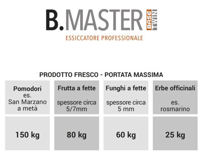 Profesionálna sušička B.Master BASE TWIN je správnou odpoveďou pre spoločnosti, ktoré chcú vylepšiť svoje výrobky a vytvoriť nové návrhy pre trh, ktorý čoraz viac dbá na kvalitu a pravosť a na kontrolu dodávateľského reťazca. Sušička B.Master BASE TWIN zahŕňa všetok potenciál profesionálnej sušičky v malých rozmeroch a je ideálna pre malé podniky, ktoré spracúvajú obmedzené množstvá výrobkov s maximálnou starostlivosťou o výsledok a rešpektom k surovinám. Vďaka všestrannosti a modulárnosti je sušička B.Master BASE TWIN optimálnym riešením pre každú potrebu, umožňuje prispôsobiť sa rôznym podmienkam používania a zaručuje možnosť neskoršieho rozšírenia systému.