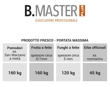 B.Master PLUS spĺňa potreby malých/stredných spracovateľov. Štandardne je vybavený elektrickým zdrojom tepla s výkonom 5,1 kW, ktorý možno nahradiť 3,4 kW vykurovacou jednotkou (voliteľne) na sušenie chúlostivých produktov, ktoré si vyžadujú nižšie teploty, ako sú napríklad liečivé rastliny. Elektrický vykurovací systém možno doplniť alebo nahradiť batériami na ohrev vody, aby sa využili alternatívne zdroje energie. Sušička B.Master PLUS má tiež modulárnu konštrukciu, a preto ju možno rozšíriť o druhý sušiaci modul na dosiahnutie vyššej produktivity.